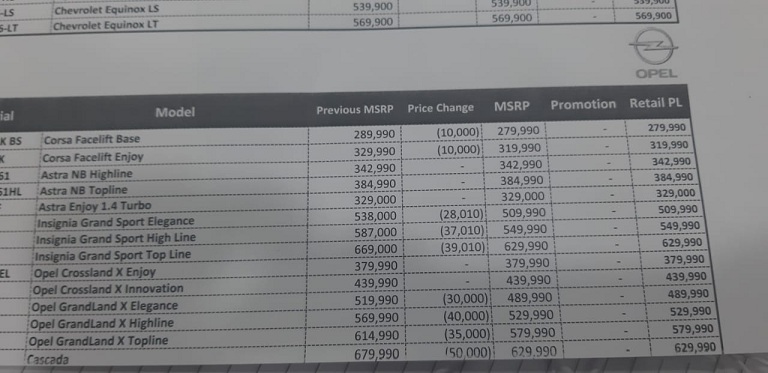 لتعتبر بذلك أول شركة تخفّض الأسعار بعد إلغاء الجمارك على الطرازات أوروبية المنشأ، وثبّتت الشركة أسعار طرازي” أسترا وكروس لاند X”، وتوضح القائمة التالية تفاصيل التخفيضات لطرازات أوبل، شاملة الأسعار قبل وبعد التخفيض وقيمة التخفيض.